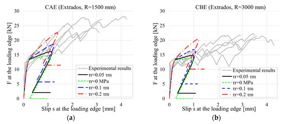 Load-slip curves obtained with different values of residual strength for (a) case CAE and (b) case CBE.
