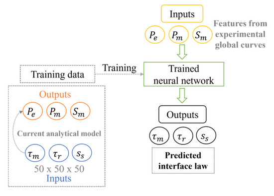 For the specific issue of inverse calibration, the data for training are structured as follows: (i) the training outputs encompass the various combinations of the parameters of the bond-slip law; (ii) the inputs for the training involve features extracted from the global curves, utilizing the aforementioned combinations within the current analytical model. Subsequently, when provided with the features of experimental global curves, the trained neural network is expected to yield the bond-slip law that corresponds to the experimental data. This process is visualized in Figure 10.