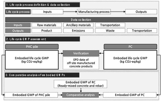 This study consists of three stages: life cycle process definition and data collection, life cycle GWP assessment, and result analysis. In the life cycle process definition and data collection stage, the manufacturing processes and the input/output data of PC and PHC pile production were investigated. Embodied life cycle GWPs of PC and PHC pile production were continuously assessed, and the appropriateness of the assessed values of both productions was verified. Finally, the embodied GWPs of PC and PHC pile were comparatively analyzed with those of conventional RC. Figure 1 shows the framework of this study.