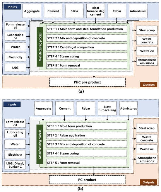 In this study, the life cycle process of each material was defined, and data corresponding to each process were collected to conduct LCAs on PHC piles and PC. To ensure the reliability of the information, field data on inputs, manufacturing processes, and outputs for producing each material were collected from three representative PHC pile production factories and five PC production factories in Korea. No significant differences were found among the life cycle processes of the materials obtained from different factories. Therefore, the life cycle processes of PHC piles and PC were defined as shown in Figure 2.