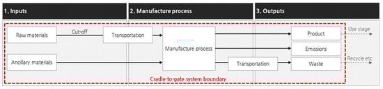 The life cycle system boundary of a prefabricated concrete product could be different depending on whether the product is considered as a material of a structure or as a structure itself. Recent studies on carbon emission of fabricated concrete products have mostly considered the products as a structure and included the construction phase within the system boundary of building LCA [,,,,]. However, to use the life cycle GWP of concrete products as an upstream emission factor for building or infrastructure LCA, the system boundary of the concrete products should be applied for the material production stage of structures. Hence, environmental product declarations (EPD) of various fabricated concrete products certified in many countries could be used in building or infrastructure LCA as an upstream process. However, EPD data of such products are rare owing to the difficulty of collecting the field data from factories.