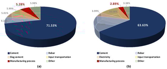 Meanwhile, as shown in Figure 4, the GWP contribution rates of off-site manufacturing processes for PHC piles and PC were 5.28% and 2.89%, respectively, among the whole life cycle GWPs. The global warming effects of the manufacturing processes, especially, were assessed very low compared to the GWP contribution rates of cement (71.53% for PHC piles and 63.63% for PC). Cement is well known to contain high levels of embodied CO2 because of the dissolution process of limestone (CaCO3), which generates CO2. However, the GWPs generated from the prefabrication process were only 7.38% (for PHC piles) and 4.54% (for PC) of the embodied GWP of cement input solely. This result implies that the off-site prefabrication process affects low GWP compared to the whole life cycle of prefabrication products and signifies the importance of reducing the embodied carbon of the inputs rather than the prefabrication processes to produce a low-carbon product.
