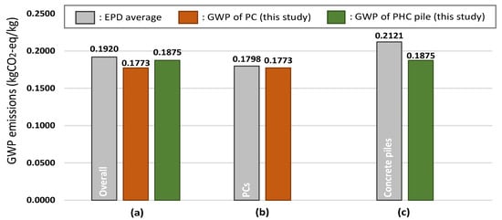 Comparison of GWP values between PC and PHC piles assessed in this study and (a) overall EPD data, (b) PC EPD data, and (c) concrete pile EPD data.