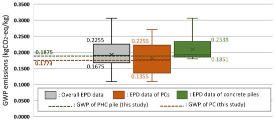 However, according to the box and whisker plots in Figure 6, GWPs of both PC and PHC piles were found to be within the interquartile range (IQR) of the estimated EPD data. The estimated range of overall EPD data was 0.1675 kg CO2 eq/kg (lower quartile) to 0.2255 kg CO2 eq/kg (upper quartile), the range of PC EPD data was 0.1355 kg CO2 eq/kg (lower quartile) to 0.2255 kg CO2 eq/kg (upper quartile), and the range of concrete pile EPD data was 0.1851 kg CO2 eq/kg (lower quartile) to 0.2338 kg CO2 eq/kg (upper quartile). Compared to the gap between the GWPs of PHC piles and EPD concrete piles, the results show that the GWP of PHC piles assessed in this study is within a reliable range, as well as the GWP of PC. Therefore, it was found that the assessed embodied GWPs of both PC and PHC piles are appropriate to use in other environmental evaluations related to off-site construction.
