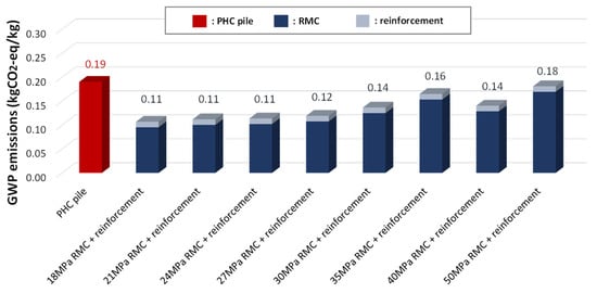 The GWPs of the material production stage of concrete structures in Korea have, up to now, been simply calculated by using the Korean national LCI of RMC and rebars, even for prefabricated concrete products such as PC and concrete piles, treating them as ordinary RC. According to the input and output data collected in this study, 1 kg of PHC piles consists of 0.97 kg of concrete and 0.03 kg of reinforcement, whereas 1 kg of PC consists of 0.94 kg of concrete and 0.06 kg of reinforcement. Figure 7 and Figure 8 compare the embodied GWPs of the conventional RC that was made in these concrete and reinforcement ratios with those of the PHC piles and PC products produced through prefabrication. To calculate the embodied GWPs of RC, the GWP emission factors for each compressive strength of RMC from Korea’s national LCI DB and those for reinforcement were applied [].