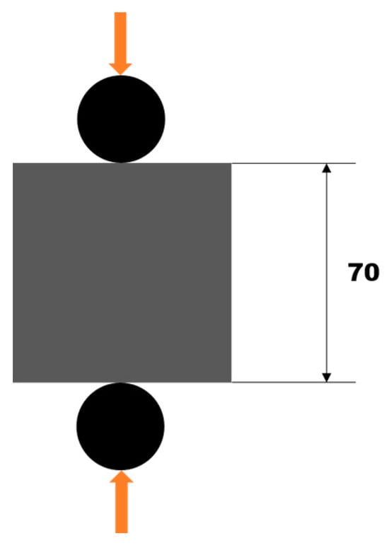The splitting tensile strength was determined on cube specimens of 70 × 70 × 70 mm according to the Russian standard GOST 10180-2012. The specimens were loaded at a rate of 0.05 MPa/s. The test scheme is shown in