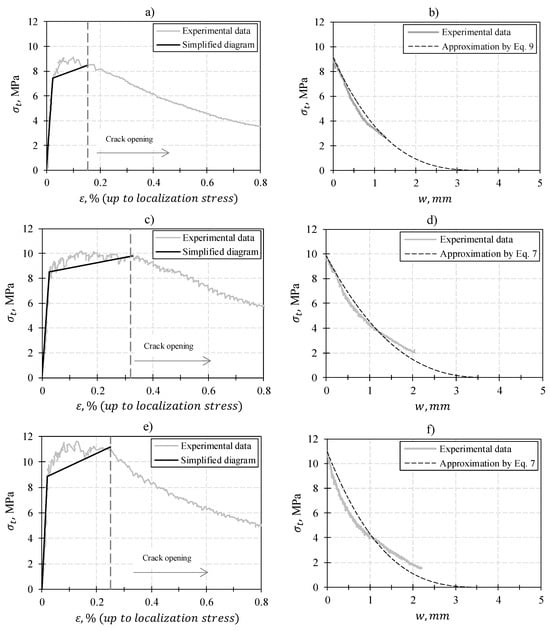 Figure 13 shows the stress–strain and stress–crack opening diagrams for the tested UHPFRC formulations. The experimentally obtained diagram averaged from the test results of three specimens is shown in gray, and the approximate results are shown in black. The solid line shows the bilinear diagram up to the stress value