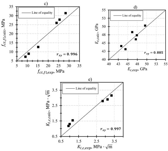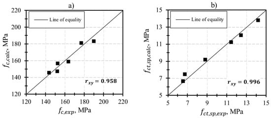 The correlation coefficient between experimental and calculated values is in the range of 0.885–0.997, which allows us to recommend Equation (16) for predicting the properties of UHPFRC with different volume content of corrugated steel fiber.