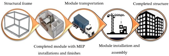 The PVMB system can be defined as a construction practice wherein most of the on-site work is shifted to factories. In the PVMB system, 3-D modules, or the building units with the structural elements, MEP (mechanical, electrical, and plumbing) services, and finishes are manufactured in the factories and then transported to the required location []. To complete the structure, assembly and installation are carried out on-site (refer to Figure 2). The foundations, lateral load-resisting systems (LLRSs), and other construction conventionally constructed on-site have also been the focus of efforts intended to develop and shift to the off-site prefabrication practices, through recent and future research, as these have been identified as the delaying activities in modular construction [,]. A modular building system comprises prefabricated units and components (connections) that help the assembly process. Steel, concrete, and timber are the most commonly used materials for constructing modules []. Although steel-based modular units and components are the most popular, hybrid modular systems are also available for construction [,,,,]. Conventional construction systems, which have yet to receive significant attention, such as masonry walls and foundations, have also been researched and developed for prefabrication in recent years [].