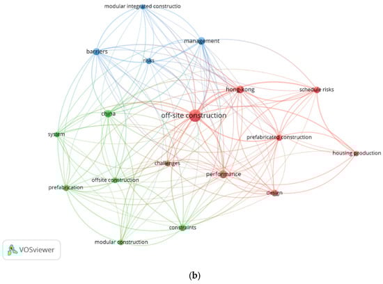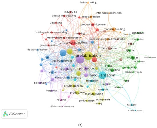 A detailed literature review was conducted to identify the factors affecting the implementation of modular technology and the effects of modular technology on the construction industry. Scopus and Web of Science (WoS) databases were used to identify the journal articles, and they were narrowed down after we read the abstracts. The search strings in Table 1 were used to identify the related research articles. A network visualisation diagram was created to recognise the fields that are related to the topic. The visualisations were created using VOSviewer software (v.1.6.18), taking the minimum number of keyword co-occurrences as five words. Figure 3a,b show the visualisation diagrams generated for the first search string in Scopus and WoS. The circles representing the keywords are weighted for the occurrence of the keywords.