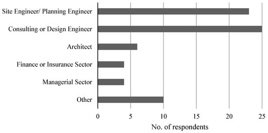 These beneficial and constraint factors are already identified as benefits and constraints in the literature. Therefore, a one-tailed test was used in choosing the sample size required for the analysis. Past research was followed to identify suitable analysis types for a relatively smaller sample [,]. The significance level (Type I error α) was considered 0.05, and the power was taken as 0.8, where the Type II error (β) was set to 0.2 []. The effect size (d) was taken as 0.3, considering the differences between the conventional and modular construction as medium []. The targeted sample size for these considered values of α, β, and d was 69. Considering all these factors, the questionnaire was prepared, and content validation through expert review following the study by Elangoven et al. [] and cognitive interviewing were done and distributed through a web link, enabling the online responses to be used to collect information from the respondents []. The professions of the respondents, the scales of the company they are working for, their work experience, and their knowledge about PVMBs were collected. The respondents were directed to assess the benefits and constraints of modular construction according to their ideology about the suitability of PVMBs in Sri Lanka. The respondents who were positive about the suitability of modular technology for Sri Lanka were asked to assess the benefits and the suitable construction material for PVMBs. Those who think modular construction is not suitable or are unsure about its suitability were asked to assess the constraints.