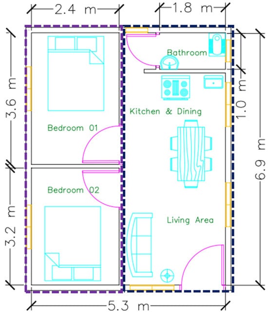 The planning of the affordable house was carried out considering the regulations set by the Urban Development Authority (UDA) in Sri Lanka []. Considering the need for houses to be low-cost, a single-story house with two bedrooms, a bathroom, and a kitchen with dining facilities attached to the living area was designed. In order to have a better internal space arrangement, the modular house was planned as two modular buildings, as shown in Figure 7. The dimensions of the small module are 7.2 m × 2.65 m × 3.0 m, and the larger module is 7.2 m × 2.95 m × 3.0 m. Since the width of the larger module is greater than the maximum permitted width of freight, which is 2.5 m (+0.15 m on each side), it would be required to get special permission from the Road Development Authority (RDA) to transport the module. The dimensions of the house, according to the UDA guidelines, are given in Table 11.