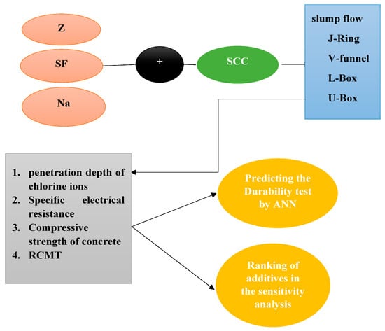 The primary objective of this research is to determine a suitable mixing design for achieving self-compacting concrete with optimal strength. Additionally, the study aims to investigate various parameters that influence the efficiency of self-compacting concrete and to examine the rheological properties of self-compacting concrete using chemical additives in order to evaluate the desired parameters of the concrete. Self-compacting materials were prepared according to Table 5 and Figure 2. Each design underwent compressive strength tests; rheology tests including slump flow box L, J-ring [], and V funnel []; rheometer tests; and durability tests including a permeability test, RCMT, and electrical resistance measurements. In this article, sensitivity analysis is used in a reliability method in combination with neural networks to identify the most effective substance. A flowchart is shown in Figure 2. In this article, sensitivity analysis is employed in conjunction with a reliability method and neural networks to determine the most influential substance. A flowchart outlining this approach is presented in Figure 2.