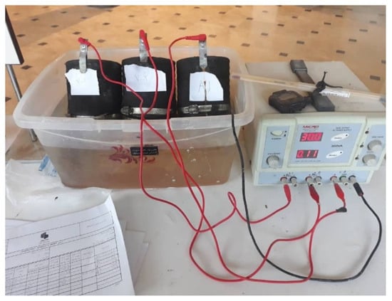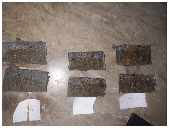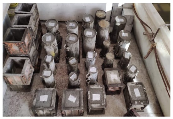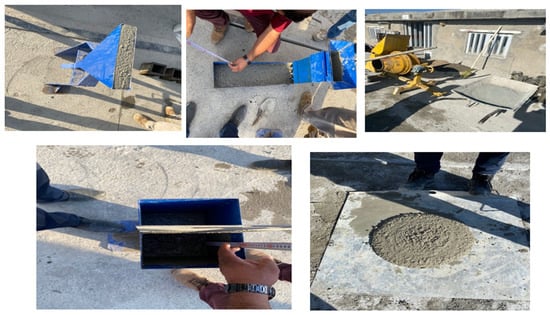 The experiments were conducted at two specific laboratories, namely Davam Bonyan and Sinab, both situated in the western region of Hamedan, Iran. The experimental procedure comprised two distinct components: mechanical tests and durability tests. In the initial phase, various parameters were evaluated at intervals of 7 and 28 days. These evaluations were conducted to examine the impact of concrete type, concrete quantity, and operational conditions on the outcomes (refer to Figure 3). The tests conducted in this study were performed in accordance with the following standards: compressive strength of concrete based on ISIRI [] (Figure 4); specific electrical resistance based on the ASTM standard [] (Figure 5); and RCMT and penetration depth of chlorine ions based on the AASHTO TP64–NTBUILD492 standards [,] (Figure 6 and Figure 7).
