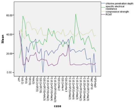 Analyzing the penetration depth of chlorine ions in the control concrete (SCC), it was found that the age of the concrete influenced the depth. The concrete aged seven to twenty-eight days showed a 15% decrease in penetration depth. The migration coefficient of chlorine ions, an essential input for estimating the useful life and determining output parameters, was measured in various designs. The SCC design exhibited the highest migration coefficient, while the Z(0.2) + SF(7) + Na(2) design had the lowest. Interestingly, including xanthan gum alone positively reduced the migration coefficient. Notably, a significant decrease in migration coefficient values at 28 days compared to 7 days was observed, indicating a reduction of up to 15% as the samples aged. The concrete’s ability to facilitate the transfer of ions within its microstructures, which infiltrate the concrete environment, relies heavily on the material’s electrical resistance. In this study, the electrical resistance values reached an acceptable level, particularly in designs incorporating xanthan gum. The varied designs exhibited higher electrical resistance than the control design, likely attributed to lower porosity and denser microstructure, with the triple design demonstrating the most significant increase. At 28 days, the specific electrical resistance experienced a 58% rise compared to 7 days. To summarize, the alterations in the examined parameters are depicted in Figure 9.