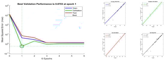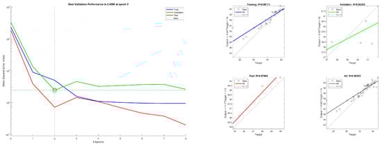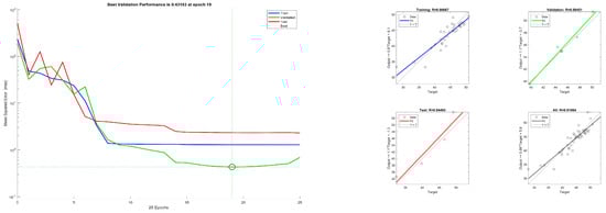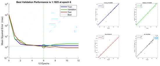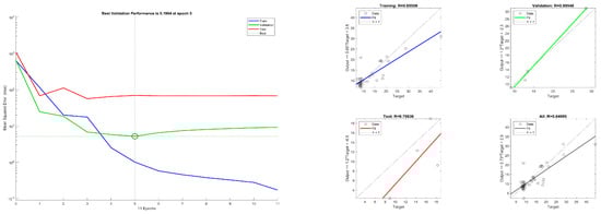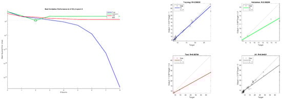 Figure 16 depicts the RCMT coefficient in concrete with the inclusion of xanthan gum and micro- and nano-silica additives. These additives are being investigated to enhance the concrete’s RCMT coefficient, which plays a critical role in the durability of structures exposed to corrosive environments. A neural network with 10 neurons was trained specifically for this purpose. The figure also provides information on the error rates observed during the training, testing, and prediction phases.
