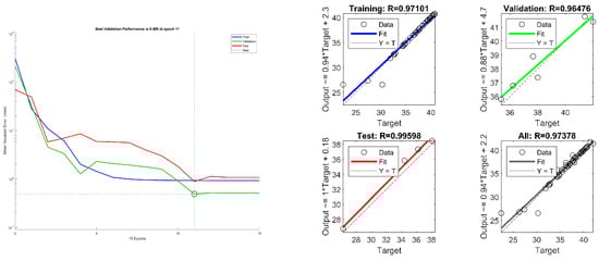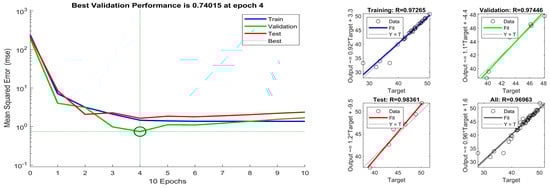 Figure 12 illustrates the electrical resistivity in concrete when incorporating xanthan gum and micro- and nano-silica additives. These additives are being investigated for their potential to enhance the electrical resistivity of concrete, which plays a crucial role in ensuring the durability of structures in corrosive environments. A neural network consisting of ten neurons was trained specifically for this purpose.
