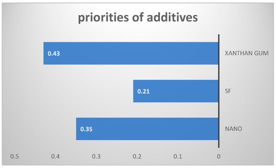 According to the analysis, xanthan gum is determined to be the most effective material with a priority rating of 43%. It is followed by nano-silica with a priority rating of 35%, and finally, micro-silica with a priority rating of 21%. Table 6 displays the ratings for the ideal, normal, and raw criteria. These findings provide valuable insights into the relative effectiveness and prioritization of the studied additives. They indicate that xanthan gum demonstrates the highest potential for enhancing concrete properties, followed by nano-silica and micro-silica.