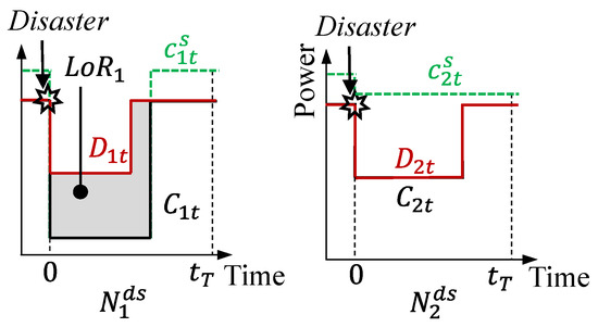 where is the pre-disaster power supply capacity of the distribution substation and is the residual functionality rate of a distribution substation; its value for a distribution substation is indicated to be 1, 0.5, 0.09, 0.04, and 0.03 for no, slight, moderate, and extensive damage, respectively [74].