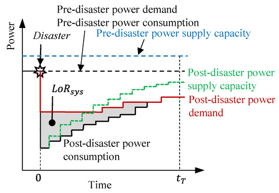 The present study adopts the demand/supply resilience-quantification framework for infrastructure–community systems proposed by Didier et al. [71] for the quantification of energy resilience of electric power–community system. The resilience-quantification framework involves the evaluation of resilience at both the component and the system levels. At the component level, the lack of resilience of the distribution substation , i.e., , is defined as the difference between the power consumption at and the power demand (Equation (9)) of the community served by during the time horizon , as expressed in Equation (10). Power consumption is the effectively consumed amount of power by at time and is dependent on the power supply capacity of and the power demand of , as expressed in Equation (11). is equal to if , meaning that can supply sufficient power for ; otherwise, is equal to if . As illustrated in Figure 2, the power supply capacities of distribution substations and power demands of communities may decrease to certain levels in the immediate aftermath of a disaster at 0 due to the damages to distribution substations and buildings, and the power supply capacities and power demands can be recovered after the implementation of restoration interventions for distribution substations and buildings, respectively. In the time horizon , the lack of resilience of is the power deficit at if the power consumption at is less than the power demand of (i.e., ), for example, the shaded area of in Figure 2; otherwise, of is zero if the power consumption at is equal to the power demand of during this period (i.e., ), for example, in Figure 2.