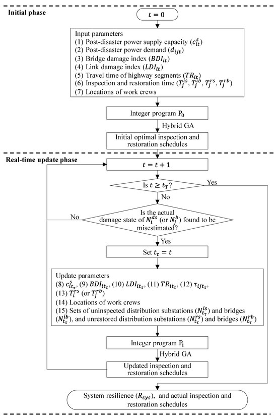 The program solution comprises two phases, as illustrated in Figure 4: the initial phase (t = 0), before work commencement, and the real-time updating phase (t > 0), coinciding with workers conducting inspection and restoration tasks. Parameters (1) to (7) in Figure 4 generate the initial ideal recovery schedules by addressing the integer program employing the proposed hybrid GA. Execution of these schedules commences during the real-time update phase. Upon reporting a misestimation of a distribution substation or a bridge’s actual damage state, the solution program updates decision variables and parameters of the integer program , including (8) to (15) in Figure 4. The schedules for inspection and restoration are then re-optimized until the working time limitation is met .