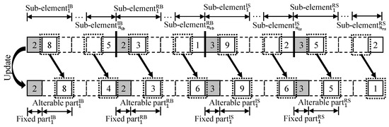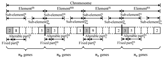Figure 5 displays the suggested encoding scheme for resolving the integer programs in the present study. Each chromosome has four components, with ElementIB and ElementRB representing the order of bridges to be inspected (i.e., ) and restored (i.e., ), respectively, by all given work crews for bridges. ElementIS and ElementRS are the order of distribution substations to be inspected (i.e., ) and restored (i.e., ), respectively, by all given work crews for distribution substations. Both ElementIB and ElementRB include genes representing bridges within the HBS, and ElementIB and ElementRB are divided into and sub-elements to represent the inspection sequences of inspection crews for bridges and the restoration sequences of restoration crews for bridges, respectively. Similarly, both ElementIS and ElementRS include genes representing distribution substations within the power-distribution network, and ElementIS and ElementRS are separated into and sub-elements to describe the inspection order of inspection crews for distribution substations and the restoration sequences of restoration crews for distribution substations, respectively. In addition, each sub-element in the integer programs is composed of a fixed part and an alterable part. This allows for adaptation to changes in the sets of uninspected distribution substations () and bridges (), as well as sets of unrestored distribution substations () and bridges (). Specifically, the fixed part of a sub-element on ElementIS (or ElementIB) records the distribution substations (or bridges) that have already undergone inspection, while the alterable part records distribution substations (or bridges) that have not yet been inspected by the worker. Similarly, on ElementRS (or ElementRB), the fixable component and flexible component of a sub-element document the distribution substations (or bridges) that have been restored by the appropriate crew and those that still require restoration. As illustrated in Figure 5, the Fixed partIS1 on Sub-elementIS1 (i.e., the grey gene on Sub-elementIS1) signifies the distribution substation that has undergone inspection by the crew , while the Alterable partIS1 on the Sub-elementIS1 (i.e., the white gene on Sub-elementIS1) represents the substations awaiting inspection by . During chromosome operations, only genes located on the alterable component undergo selection for crossover and mutation, while the unchangeable sections remain unaffected. This ensures that the sequences of distribution substations in and bridges in for inspection, as well as and for restoration, are updated at every re-optimization.