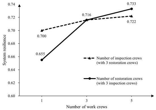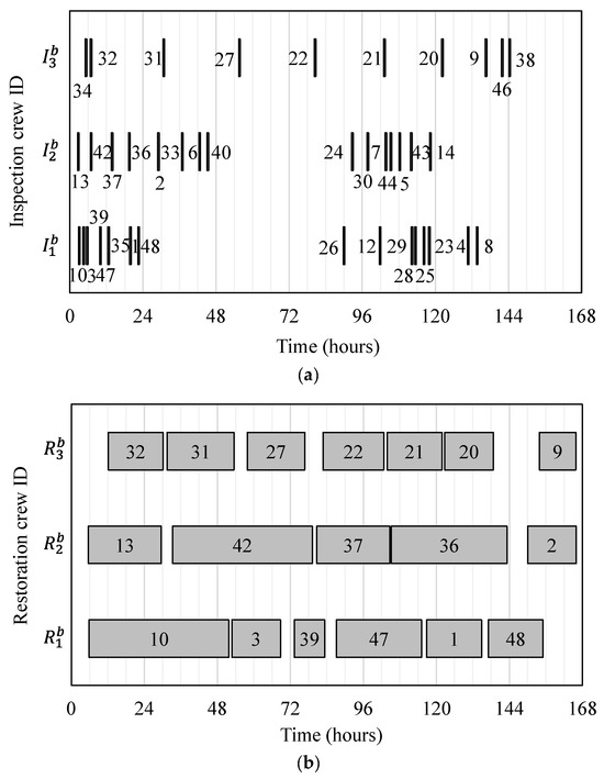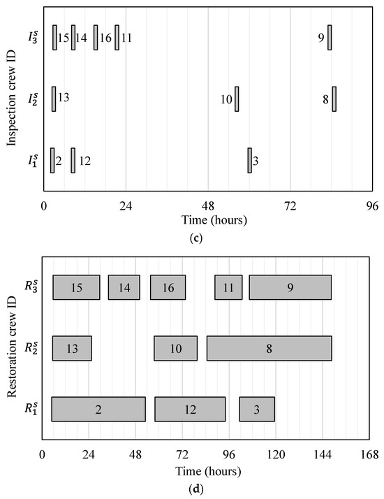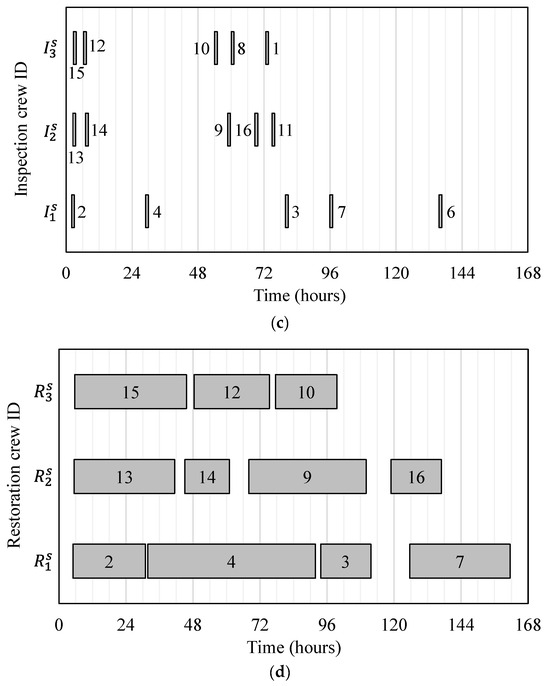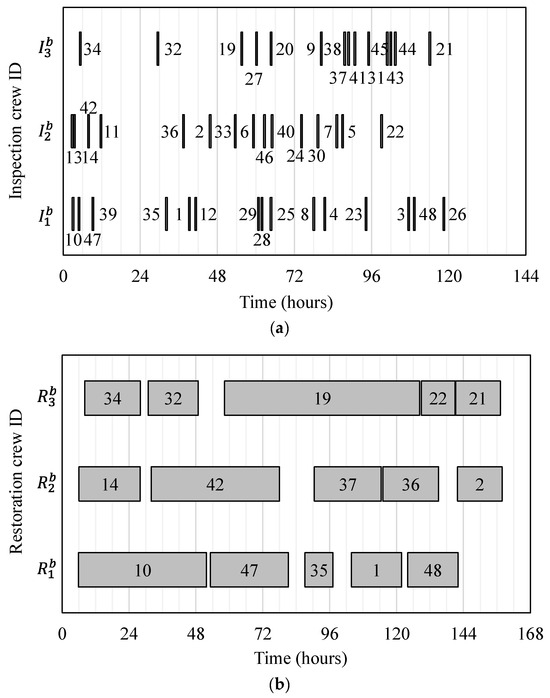 In practical scenarios, a physical inspection may entail a considerable amount of time. For example, the China Ministry of Transport’s guidelines provides a seven-day initial inspection of aging bridges that are very susceptible to severe damage and a one-month comprehensive examination of every bridge in the impacted area [46]. Although inspection only progressively reveals a system’s damage information, it is acceptable to believe that restoration of a specific system component can begin immediately as the damage data necessary for emergency restoration actions are available through initial assessment. Therefore, emergency inspection and restoration actions can be carried out simultaneously at diverse places.