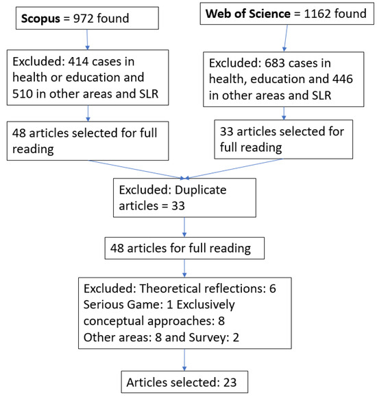 Of the 48 articles found, after reading, 25 were excluded. Six were excluded because they were only theoretical reflections on gamification in the production sector—this type of study, despite dealing with gamification in production, does not meet the requirement of being an empirical study. One was disregarded because it was a serious game in manufacturing—serious games are for non-entertainment purposes and can be distinguished from gamification in that they are complete, while gamification only has game parts [7].