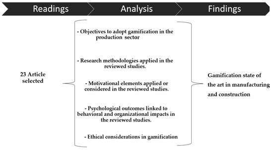 Figure 2 displays the research progress after reading the 23 articles. The following topics were examined in each article: the objectives of implementing gamification in the context of the production sector, the research methodologies used, the gamification elements used or considered in the studies reviewed, psychological outcomes and behavioral and organizational impacts, and ethical considerations in gamification. This allowed for the identification of research needs in the situations explored, as well as an understanding of the state of the art in the manufacturing and construction industries.