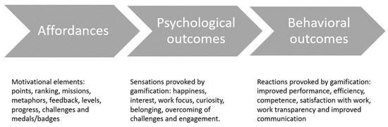 This study analyzes gamification based on three dimensions related to the focuses of interest: gamification design (affordances), intermediate psychological outcomes, and behavioral outcomes [28], as shown in Figure 3. The affordances can help communicate abstract ideas without many instructions; for example, points, ranking, medals/badges, progress/challenges, and levels are the affordances of a gamified system.