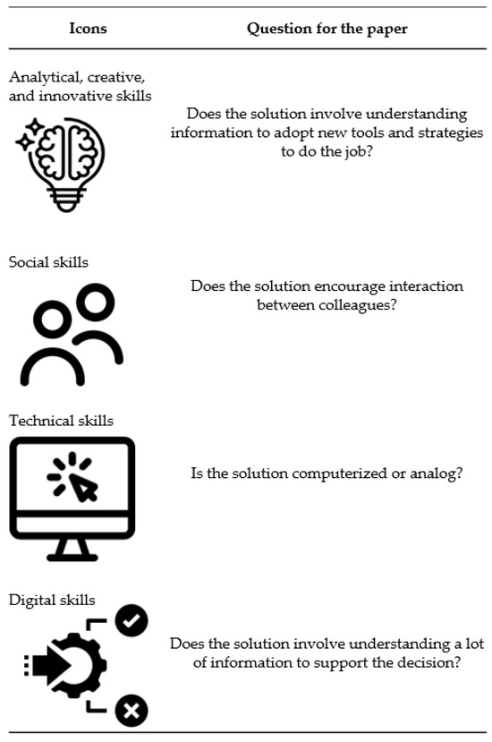 The Tables in Appendix A also present an analysis of the associated skills that can be developed using gamification implementation, considering the SLR of [13] and displaying icons to indicate the different competencies. The questions shown in Figure 4 were asked in each case to identify the skills that can be stimulated through gamified solutions.
