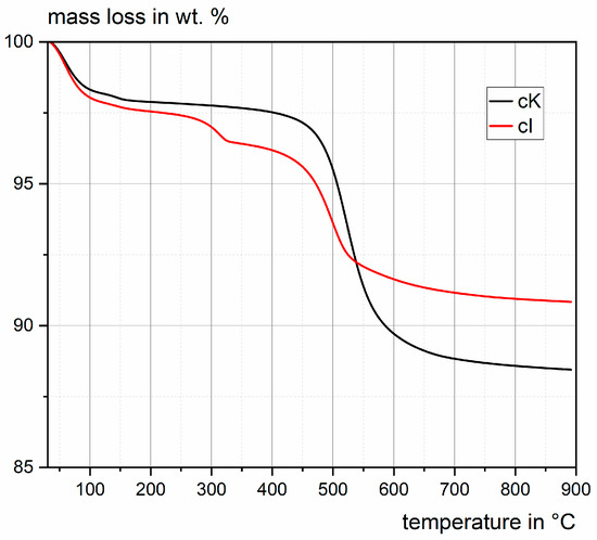 In our system, the differences between the precursors are found in the amount of the amorphous portion, the accompanying minerals (Table 2), and the composition of the amorphous portion (Table 3). As described in Section 2.1, the accompanying minerals only participate to a limited extent or not at all in the reaction and can, therefore, be excluded from consideration. The amount of the amorphous fraction is, therefore, more decisive. Here, a difference of 53.1 wt % for cK to 34.1 wt % for cI can be seen. The ratio of SiO2 to Al2O3 in the amorphous portion is similar for both precursors (cf. Table 3). However, the precursor cI has an increased Fe2O3 content, which may also have an influence. Provided that all aluminum and silicon contents are soluble, the available network builders are higher with cK. Thus, the potential to obtain higher compressive strengths is also greater. However, this potential does not translate as 1:1 for the compressive strength, as the compressive strength of these systems is relatively meager and is below the compressive strength of those systems with the precursor 1 cI.
