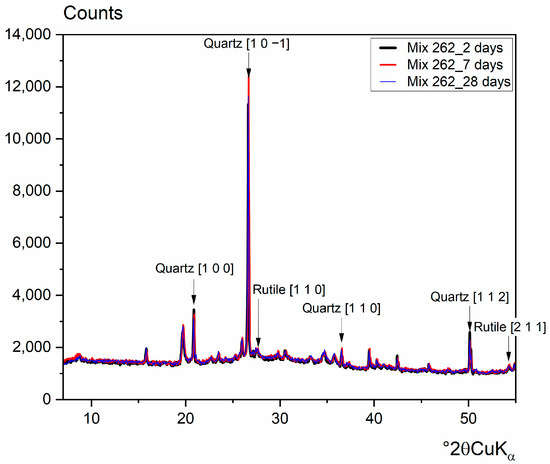 Ex situ XRD diffractogram of the 2-, 7- and 28-day storage samples (Mix 262).