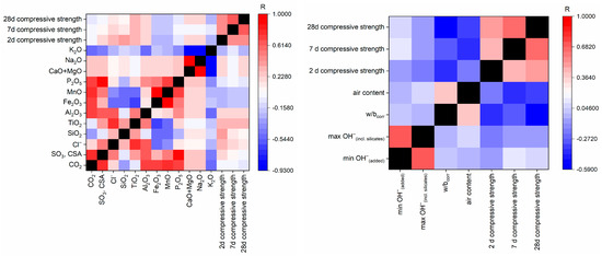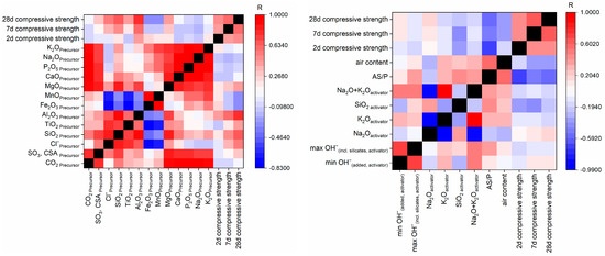 Figure 5 shows a heatmap, calculated using OriginLab (Version 2022b), showing the first approach. The results represent linear relationships between the individual parameters of the total chemistry of the pastes, the corrected w/b value, the air void content, the compressive strength, and the contents of the hydroxides. Two hydroxide concentrations were calculated, namely, the minimum concentration results from the amount of either NaOH or KOH that was added. The maximum concentration was calculated under the assumption that, in addition to the hydroxides, all alkali silicates in the activator solution also dissociate entirely and that there is one hydroxide ion for every Na+ or K+ that is contained. This approach was adopted according to a previous study [26]. The blue color marks a negative correlation. A negative correlation means that when value A decreases, value B increases. The red color marks a positive correlation, i.e., when value A increases, value B also increases.