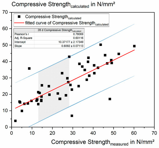 The results of the 28-day compressive strength test are shown in Figure 9 and the formula is shown in Equation (3). The values are more scattered than in Figure 7, but are less than those in Figure 8. Here, too, statistical outliers are recognizable. The Pearson R-value here is 0.78, defined as a strong correlation.