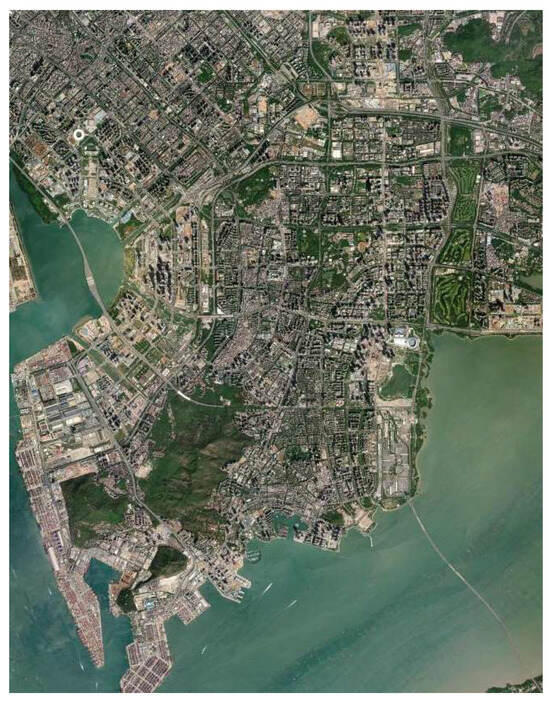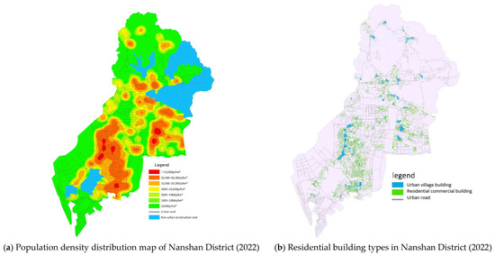The basic data included three aspects: urban public open space data, building and population distribution data, and urban-road spatial information data. The public open space data of Nanshan District were derived from the Public Open Space Planning of Shenzhen Special Economic Zone (Shenzhen Municipal Commission of Planning and Land Resources, 2006), Shenzhen Parks Inventory in 2022 (Shenzhen Municipal Bureau of Urban Management and Comprehensive Law Enforcement, 2023) [38]. The building and population distribution data, based on the Shenzhen Building Information Census data in 2022, were extracted from the residential building data (categorized into general residences and villages in the middle of the city), and after being combined with satellite remote sensing images and street maps at the December 2022 time point, as well as field surveys (Figure 1 and Figure 2), the residential building data were adjusted and updated. At present, China’s urban population statistics take the community as the smallest unit, and scholars in China have reported that the community population in Nanshan District has a significant correlation with the general residential floor area and the residential floor area of urban villages in the community via analysis using a multiple regression model [39]. In this study, the community population statistics of the Seventh National Census Data of Nanshan District in 2021 [40] and the general residential building and urban village building statistics of the community in 2022 were used. A linear regression analysis using the census population and residential building area can obtain the following multiple regression equation (Sig < 0.005) via SPSS linear regression analysis: