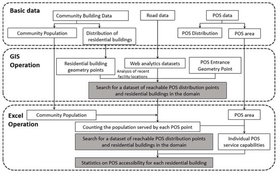 Operational flowchart of quantitative accessibility evaluation based on the Gaussian two-step mobile search method (GIS analysis and Excel calculation).