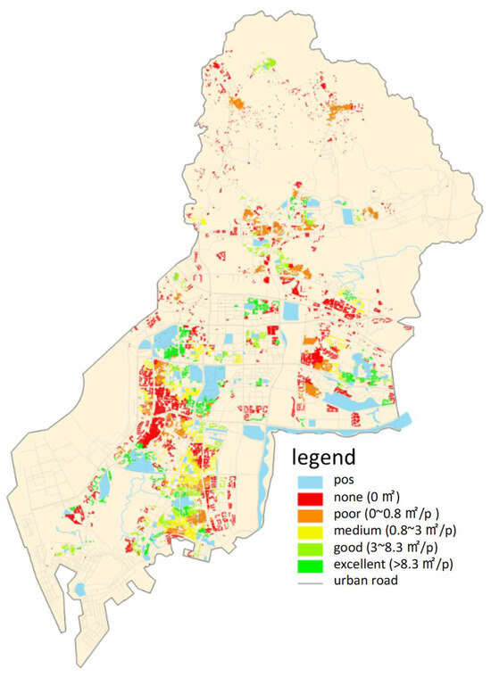 According to the area indicator stipulated in the 2006 Shenzhen Special Economic Zone Public Open Space Planning, which stipulates the standard for the allocation of public open spaces, the area of an independently occupied public open space should not be less than 0.8 m2/person, and the ideal value should be 8.3 m2/person. The accessibility index is divided into excellent (>8.3 m2/person), good (3~8.3 m2/person), medium (0.8~3 m2/person), poor (0~0.8 m2/person), and none (0 m2) at six levels. The per capita public open space accessible area for residents of Nanshan was calculated, and the results of the calculation are shown in Figure 6.