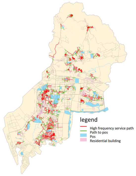 From the perspective of walking paths, as shown in Figure 7, the green paths are the paths that Nanshan District residents can take to reach a public open space within a 500 m walk, of which the red paths are the high-frequency and important walking channels connecting public open spaces in the city, carrying a large number of travel demand, which can be regarded as a kind of striped public open space network and provides the spatial continuation of public open spaces at the street level. These paths play an important role in connecting residential buildings and public open spaces as a whole. Based on the statistics of the number of people passing through the flyovers and underpasses of the district’s barrier arterial roads, it can be concluded that there is a high frequency of use of these cross-street channels, flyovers have become an important connection channel in the area, and a reasonable choice of flyover location can play an important role in connecting the blocked areas.