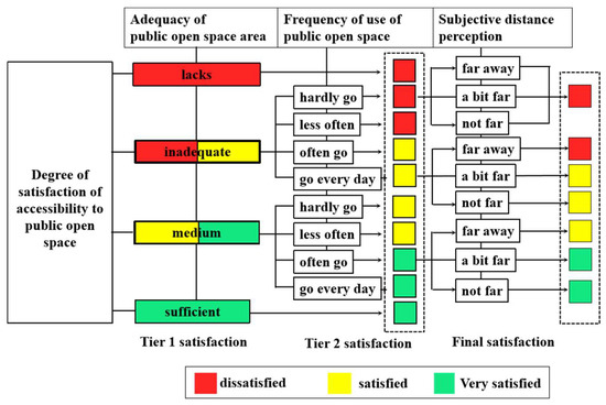 Considering that the subjective feelings of residents are influenced more by personal emotional factors, their satisfaction of public open space accessibility was not directly asked in the questionnaire, but was comprehensively evaluated using multiple questions that were superimposed on each other. Based on the quantitative evaluation results, this study divided the per capita accessible area of public open space into four standards: excellent, good, medium, and poor. In the process of determining the subjective satisfaction of residents, it was also necessary to ask the question, “Is the area sufficient?”, as the first-level question, and then the results of the questions that could reflect the residents’ satisfaction were superimposed on the first-level question; in this way, the residents’ satisfaction with the accessibility of public open space in their residential area was obtained and classified into “dissatisfied”, “ satisfied”, and “very satisfied” (Figure 9).