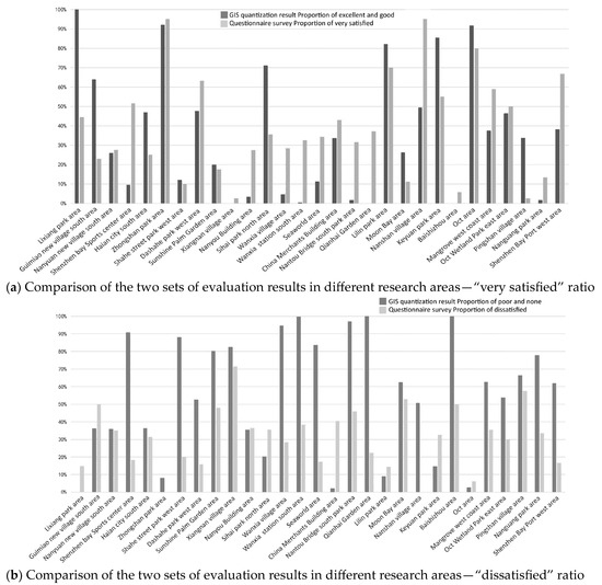 The bar charts comparing the proportions of “very satisfied” and “dissatisfied” in the GIS quantitative evaluation results and the field survey results in each research area are shown in Figure 12. The areas showing a significant difference between the two sets of results are identified in the bar charts.