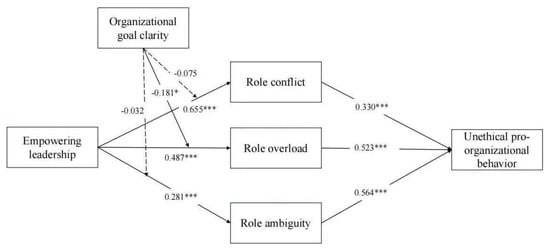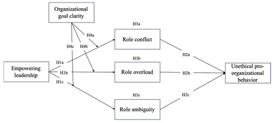 Therefore, this study strives to explore the dark side of empowering leadership that underpins employees’ tendency to engage in unethical pro-organizational actions. Specifically, empowerment from leaders may increase employees’ duty orientation, which drives them to serve the organization beyond the expectations or responsibilities initially imposed on them [,,]. When employees become aware that their limited resources and capabilities cannot fulfill the different role expectations, role stress may arise []. To alleviate the role stress caused by empowerment, employees may adopt UPB. In this regard, role stress (including role conflict, role overload, and role ambiguity) can potentially mediate between empowering leadership and UPB. In addition, this study suggests that organizational goal clarity—meaning the extent to which an organization clearly states the job goals—can moderate the relationship between empowering leadership and role stress. This study thus involves organizational goal clarity as the boundary condition (i.e., moderator) to manifest a more real project situation.