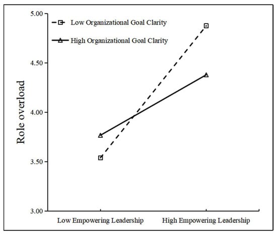 H4 postulated that organizational goal clarity can ease the positive influence of empowering leadership on role conflict (H4a), role overload (H4b), and role ambiguity (H4c). However, the results show that the interaction effects of empowering leadership and organizational goal clarity on role conflict (H4a: β = −0.075, p = 0.253 > 0.05, 95% confidence interval = [−0.196, 0.067]) and role ambiguity (H4c: β = −0.032, p = 0.726 > 0.05, 95% confidence interval = [−0.216, 0.150]) were not significant. Thus, H4a and H4c were rejected. H4b was supported (β = −0.181, p = 0.029 < 0.05, 95% confidence interval = [−0.343, −0.021]), indicating that organizational goal clarity can only affect the relationship between empowering leadership and role overload. To further understand the supported moderating effect, the slope chart was plotted in greater detail, as shown in Figure 3. As can be seen, the line labeled “High Organizational Goal Clarity” has a milder gradient than that labeled “Low Organizational Goal Clarity”, indicating that when the goal clarity is higher, the positive relationship between empowering leadership and role overload becomes weaker, hence supporting H4b.