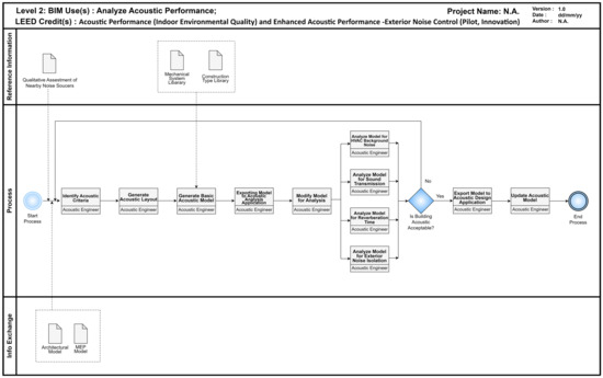 Figure 7 visually presents the Liv.2 BIM process map for the “Analyze Acoustic Performance” BIM use, aligning it with specific LEED credits. This map highlights the successful fulfillment of requirements for credits such as “Acoustic Performance” and “Enhanced Acoustic Performance—Exterior Noise Control”, showcasing how integrated BIM processes can effectively contribute to achieving sustainability goals.