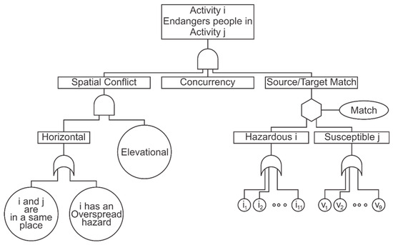 The degree of hazardousness from overlapping activities will be first discussed in this section. As shown in Figure 1, a Fault Tree Analysis (FTA) was used to logically describe the anticipated degree of hazardousness from overlapping construction activities. As shown in Figure 1, the three main factors that have an impact on the anticipated degree of hazardousness resulting from two overlapping activities are (1) the activities’ spatial overlap, (2) the activities’ concurrency, and (3) the activities’ source–target match, which is a newly introduced parameter that is described later. It should be noted that the absence of any of these factors will eliminate the hazardousness that may result from the two overlapping activities.