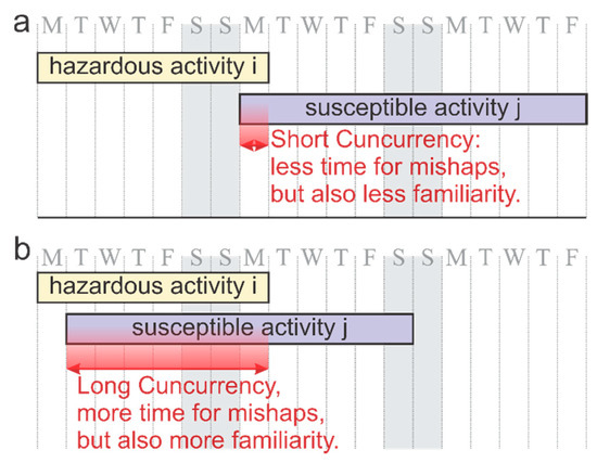 The duration of overlapping activities plays a crucial role in assessing safety risks. As illustrated in Figure 2, there exists a fundamental correlation between the duration of overlap and the nature of the risks involved. A short period of concurrency between a hazardous activity (i) and a susceptible activity (j) offers limited time for potential mishaps to occur. However, it also implies less time for the workers in the two activities to become familiar with each other’s presence and get prepared for potential hazards. Conversely, a longer concurrency duration allows more time for mishaps to potentially take place but also increases the familiarity between the activities, potentially leading to a reduction in safety risks. It is essential to clarify that our current research does not delve into the intricate dynamics of how risk probabilities shift with varying durations of overlap. This question remains open: Does a longer concurrency period significantly elevate the probability of accidents, or does the increased familiarity between tasks effectively mitigate the dangers posed by overlapping activities? These intriguing aspects of safety risk assessment warrant further investigation.