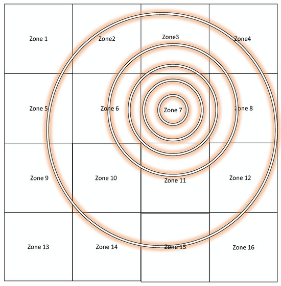 The second condition of special conflict is horizontal conflict. Horizontal conflicts pertain to activities with extensive spatial demands that conflict with tasks in adjacent zones or overlap workspace, leading to equipment or personnel obstructing neighboring zones. For example, large machinery operations may conflict with tasks in nearby areas, impeding the smooth progress of work and potentially causing safety risks. These horizontal conflicts result from the spatial overlap of activities and the limited physical space available on construction sites. A construction site can be divided into zones to assess the hazard spread from an activity, say activity (i), to which activity (j) is exposed if placed in the same zone as activity (i) or the hazard is able to spread over other zones. The activity shown in zone 7 of Figure 4 spreads its hazard over other zones except zone 13. In fact, not only two activities in the same zone could have horizontal conflict, but hazardous activity that can spread over other zones can be considered as horizontal conflict. Therefore, to assess the horizontal conflict, we need to divide the construction site into different zones.