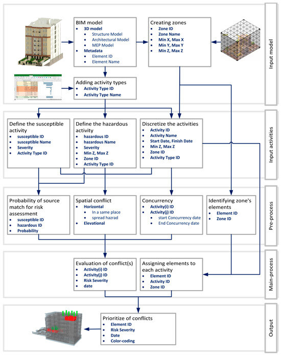 In the complex realm of construction projects, Building Information Modeling (BIM) has become an invaluable tool for safety managers to identify and understand risks more effectively and enhance the dynamic visualization of safety procedures [11,12]. This research introduces a BIM-based framework to identify a previously overlooked safety risk arising from overlapping activities. The process involves three key steps: (1) defining conditions under which overlapping activities intensify the risk, (2) prioritizing risky activities with overlapping conflicts through risk assessment, and (3) automating and visualizing the identification process using BIM to enhance accessibility for safety managers.