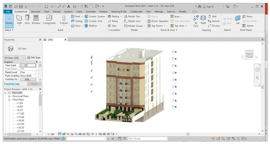 The proposed model analyzes a seven-story residential concrete building as shown in Figure 6, the construction schedule of which comes from Navisworks, and the AEC and MEP from Revit. The LOD 300 in this framework is sufficient since it allows us to link the work breakdown structure to it. Each roof is divided into four zones, A, B, C, and D, and for simplicity, general activities such as surveying, material handling, demolishing, excavation, paving, formwork installation, reinforcement installation, column concrete pouring, rebar welding, roof installation, MEP installations, and interior finishes have been considered as follows: