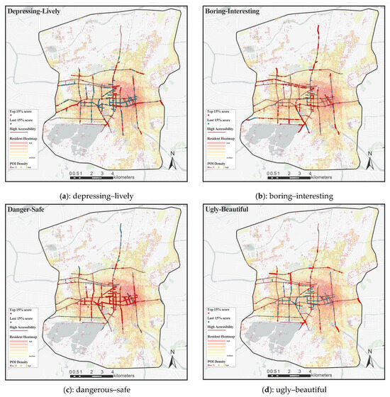 Low perception scores in street environments overlap considerably in the ugly–beautiful score and depressing–lively score dimensions, with most overlaps occurring in the city center and western city regions. These areas largely comprise older urban districts with narrow streets, necessitating color transformations and adjustments to enhance the commuting experience for residents.